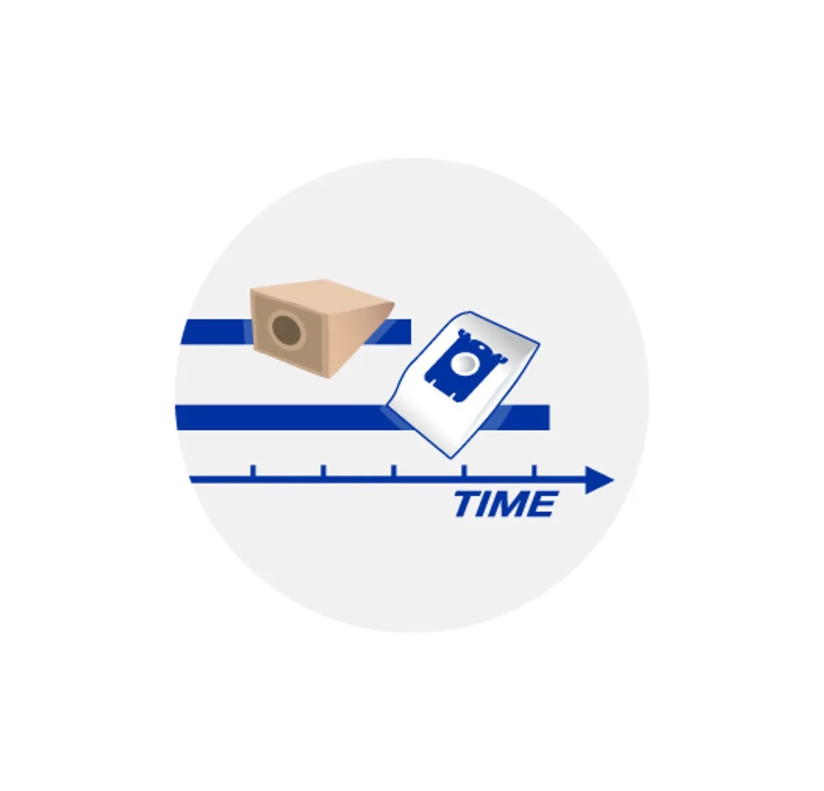 Sacii de praf sintetici DURAFLOW™ Fresh au o durată de utilizare cu până la 50% mai lungă decât sacii de praf normali din hârtie. Acest lucru se datorează structurii materialului, care îi oferă sacului o capacitate îmbunătățită de reținere a prafului și, în același timp, permite o putere de aspirare constant ridicată, pe măsură ce sacul se umple.